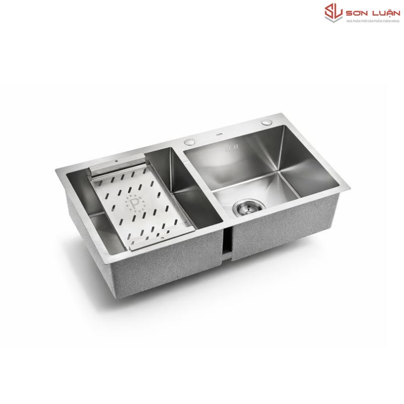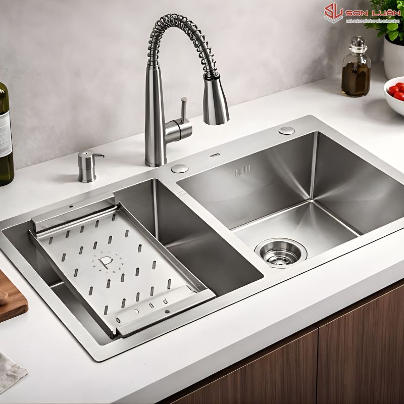 • Cấu trúc Hố Lệch (1 To - 1 Nhỏ): Giúp tối ưu hóa công năng. Hố to vẫn đủ sức chứa những chiếc chảo đường kính 28-30cm, trong khi hố nhỏ giúp bạn rửa rau, tráng bát nhanh mà không tốn nhiều nước.