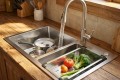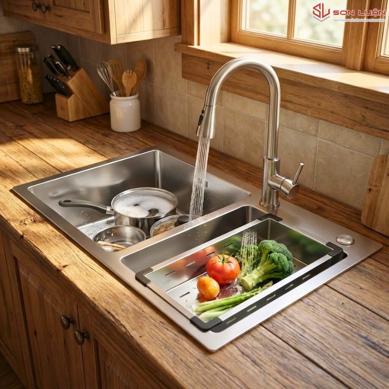 • Hố nhỏ (Bên phải): Tiết kiệm nước tối đa. Dùng để rửa rau củ, hoa quả hoặc tráng bát đĩa số lượng ít. Đây là giải pháp kinh tế giúp giảm hóa đơn tiền nước hàng tháng cho gia đình bạn.